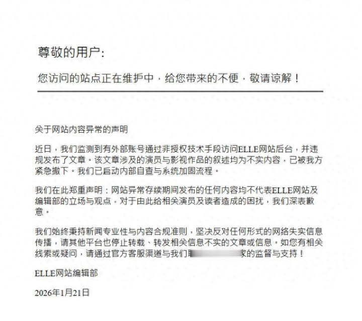 {jz:field.toptypename/}关于网站内容异常的声明近日,我们监测到有外部账号通过非授权技术手段访问ELLE网站后台,并违规发布了文章。该文章涉及的演员与影视作品的叙述均为不实内容,已被我方紧急撤下。我们已启动内部自查与系统加固流程。我们在此郑重声明:网站异常存续期间发布的任何内容均不代表ELLE网站及编辑部的立场与观点,对于由此给相关演员及读者造成的困扰,我们深表歉意。我们始终秉持新闻专业性与内容合规准则,坚决反对任何形式的网络失实信息传播,请其他平台也停止转载、转发相关信息不实的文章或信息。如您有相关线索或疑问,请通过官方客服渠道与我们联系。感谢大家的监督与支持!