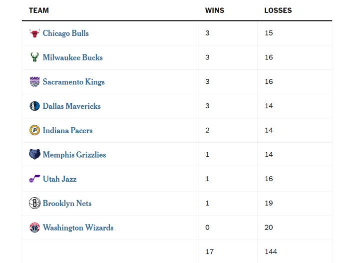 总体而言,这八支摆烂球队自交游限度日以来对阵二十支正宗球队的战绩是17胜144负,胜率为10.6%,自全明星赛以来平均输分达到13.9分。而在交游限度日之前,光芝加哥公牛队就赢了18场对阵季后赛二十强的比赛。