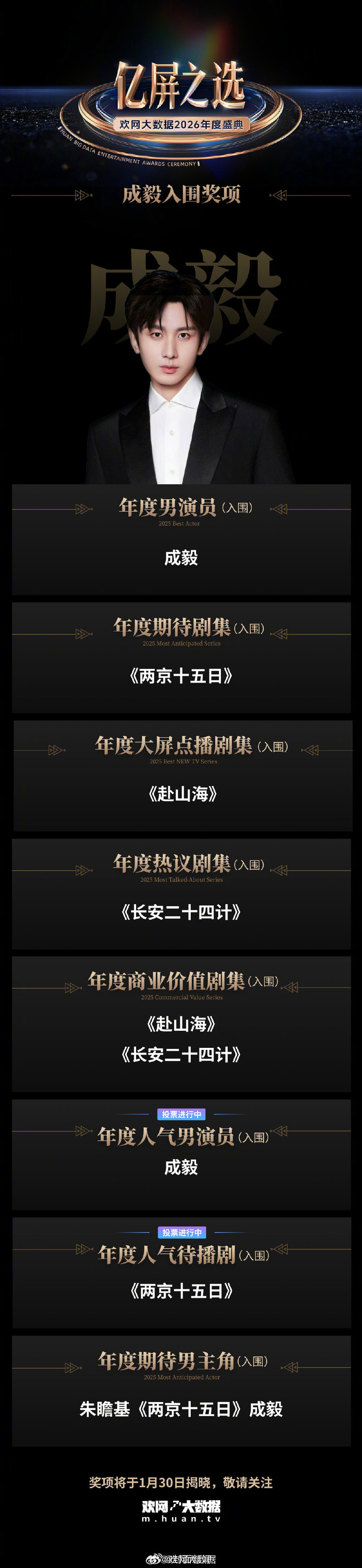 [#成毅凭3部剧获9项提名#]#成毅新剧未播已获2项提名#1月21日,据@欢网大数据,演员@成毅在2026年欢网大数据年度盛典“亿屏之选”中获得9项提名,包含:年度男演员、年度人气男演员、年度大屏点播剧集(《赴山海》)、年度热议剧集(《长安二十四计》)、年度商业价值剧集(《赴山海》《长安二十四计》)、年度期待剧集(《两京十五日》)、年度人气待播剧(《两京十五日》)、年度期待男主角。