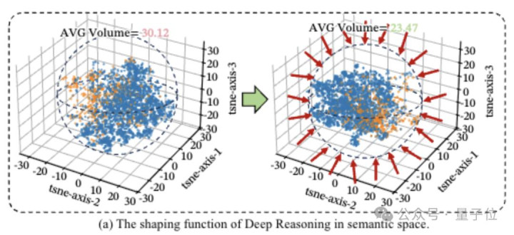 还对比了反想前后的想维范围,反想前,语义空间体积是35.2,反想后,径直压缩到31.2。
