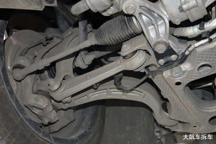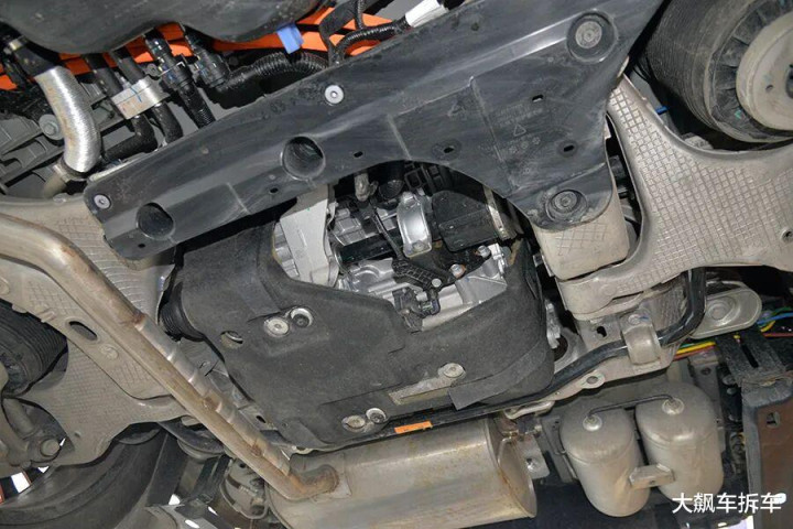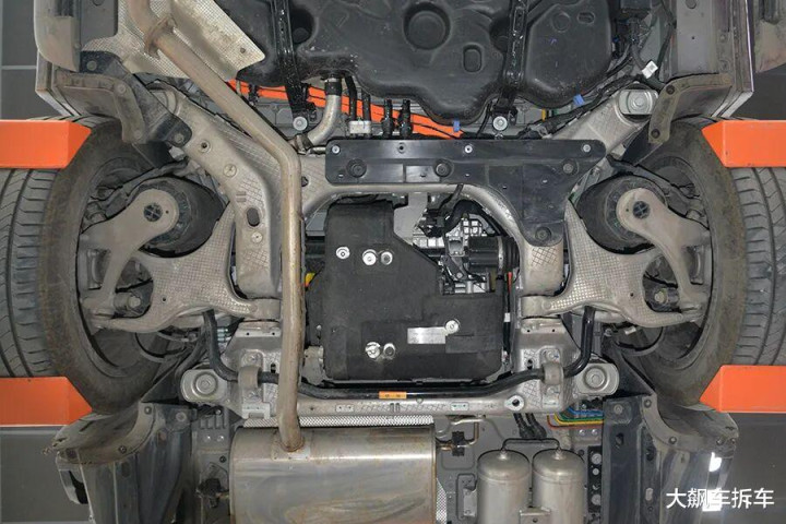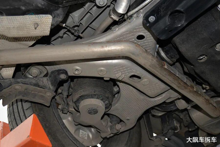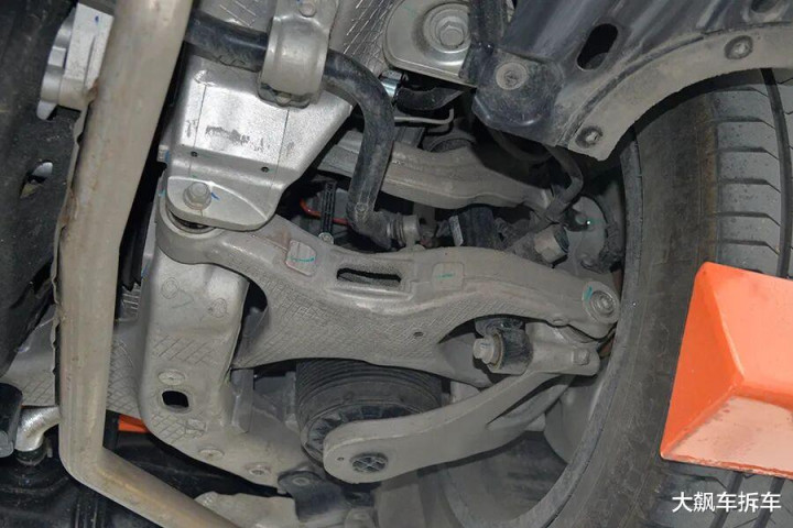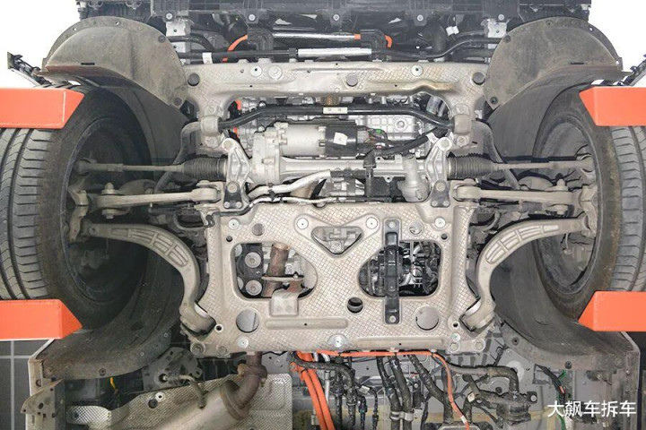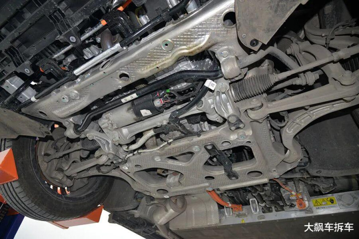 前副车架是粗壮的铝合金全框式副车架,结构相等复杂,委果可以作为一块大铝锭。