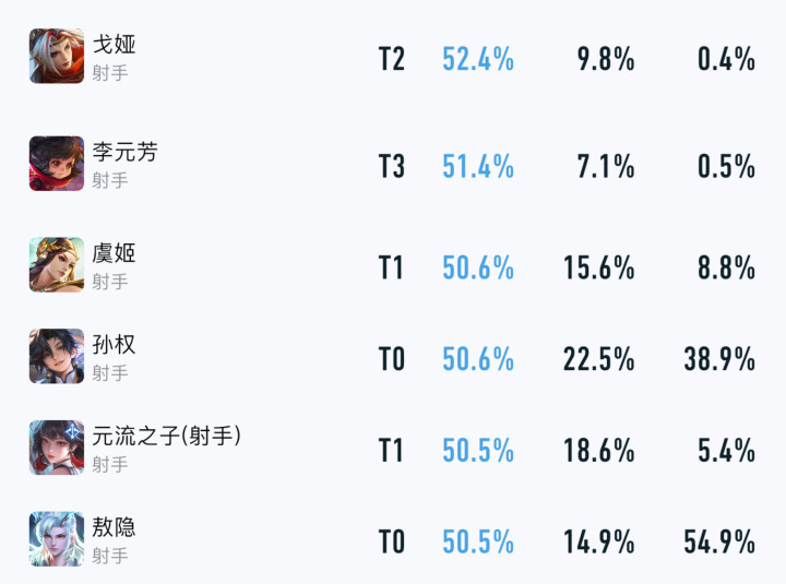 咫尺阶段发育路冲分最快的6位弓手别离是戈娅、李元芳、虞姬、孙权、元射、敖隐!