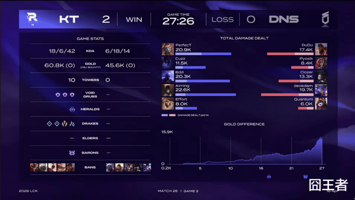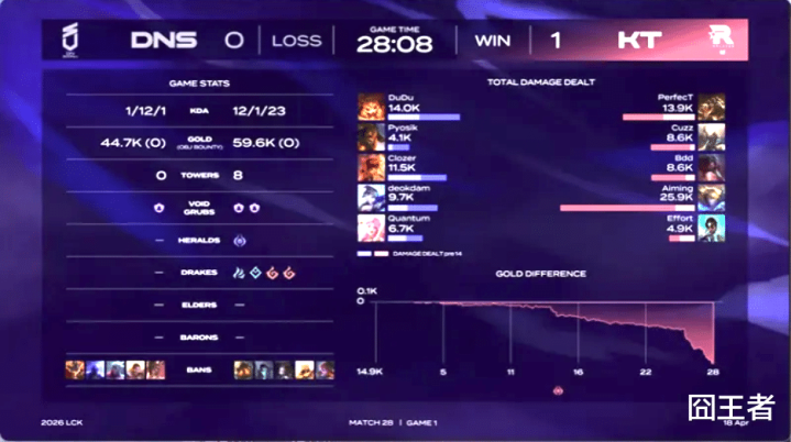 成果第一局比赛,完全王人全的是KT的文娱爽局。7分钟,阿卡丽切死寒冰,后续被歌姬击杀;15分钟,KT在开赴击杀DNS下路双东说念主组;25分钟,KT龙团坚贞开团打出0换4,随后拿下龙魂;最终28分08秒,KT攻入高地随后顺利一波