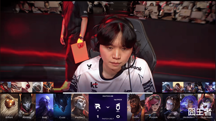 第二局比赛,DNS蓝色方,禁用:兰博、瑞兹、韦鲁斯、杰斯、梅尔,给与:Dudu纳尔、Pyosik皇子、Clozer安妮、Deokdam寒冰、Quantum歌姬;KT红色方,AG中国手机官方网页版禁用:泰坦、掘墓、发条、沙皇、兔子,给与:PerfecT鳄鱼、Cuzz潘森、Bdd阿卡丽、Aiming EZ、Effort扇子妈