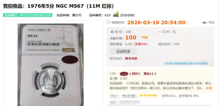 不外你如果大略找到品相好的硬币,亦然有一定的增值的。大家看,这是一枚1976年的5分硬币,在2026年的3月份,这枚评分是67分的评级币卖出了104元的价钱。