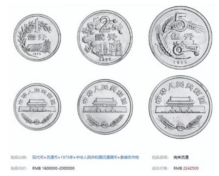 大家看,这是1975年的1分、2分、5分硬币,在前几年的拍卖会上卖出了224.25万的高价。它不是平淡的硬币,它是一套试铸币。