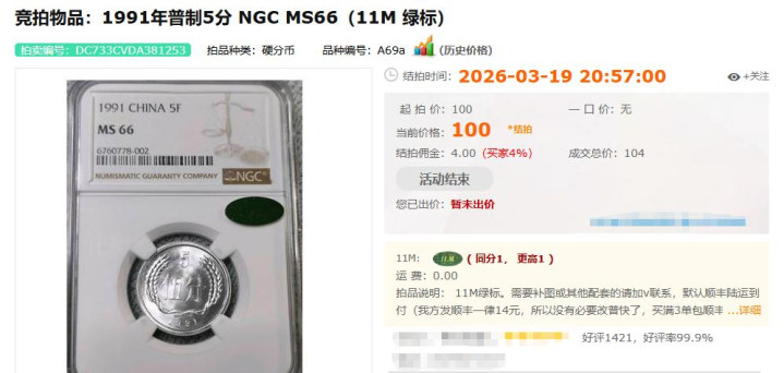 再看一枚1991年的5分硬币普制币,评级是66分。这枚硬币不异卖出了104元的高价。像这么的硬币,米兰app官网主要即是因为它的品比拟较好,才有彰着的增值。如果开放品,基本上即是按斤卖了。