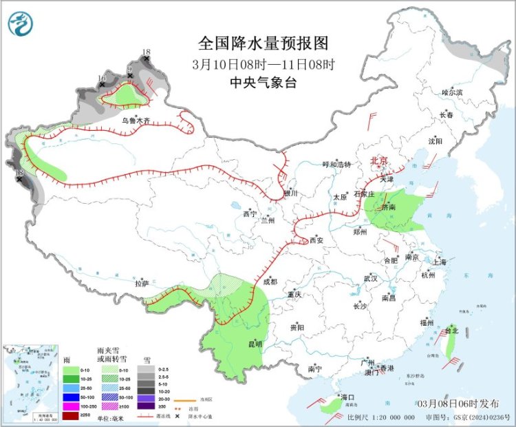 此外,3月10日,新疆北疆北部和南疆西部高海拔山区等地部分地区有小到中雪或雨夹雪,局地大到暴雪。