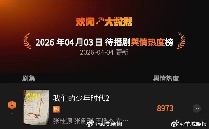 [#咱们的少年期间2热度伙同3天TOP1#]据欢网大数据音信,4月3日待播剧舆情热度TOP10出炉,电视剧《咱们的少年期间2》伙同3天登顶榜首!