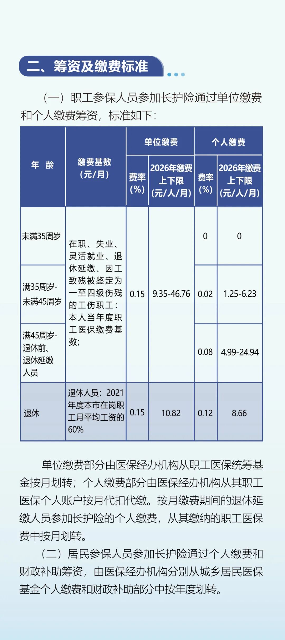 💡在筹资机制方面,确立健全单元、个东说念主、政府、社会等多元筹资渠说念,恒久照料保障费率和谐法例在0.3%傍边,缴费基数与收入水平挂钩。
