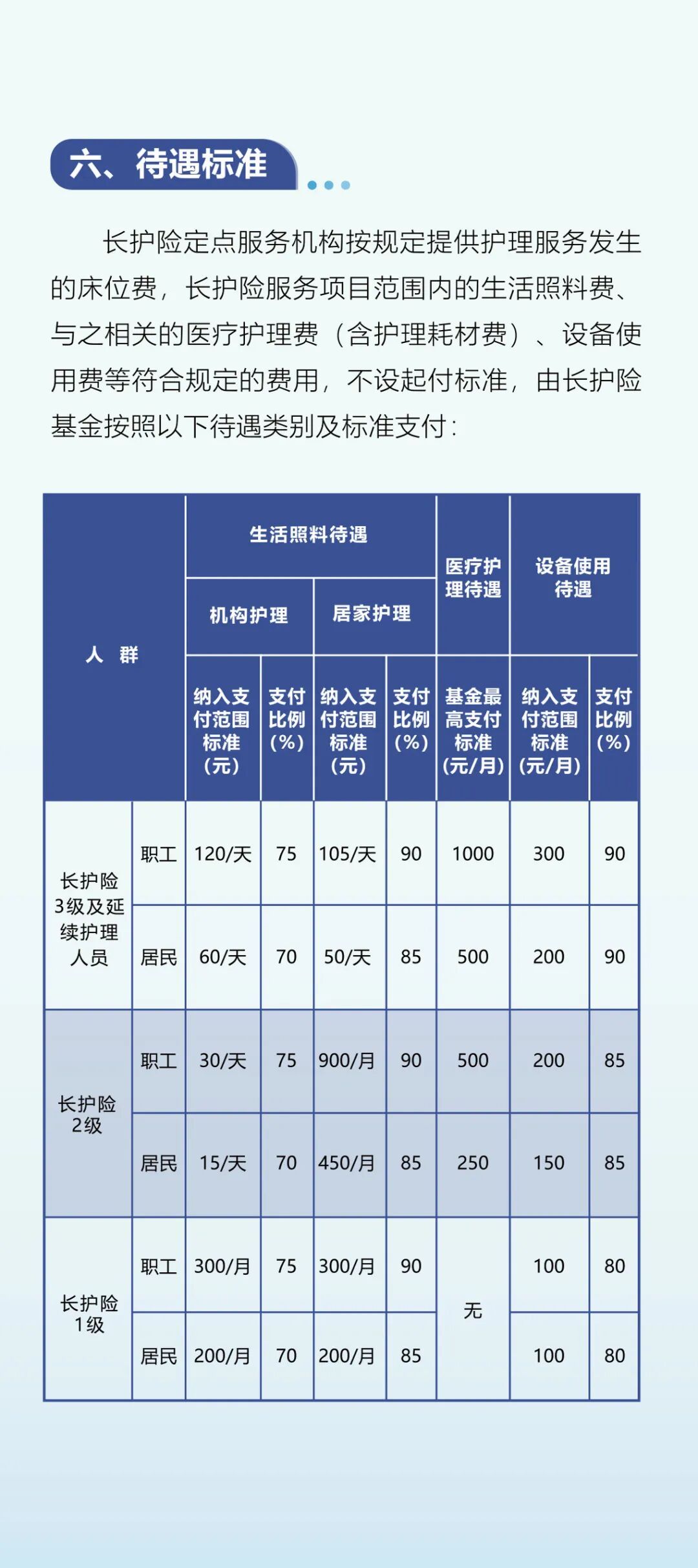 💡在待遇保障方面,恒久照料服务主要分为居家照料、社区照料和机构照料。基金用于支付稳妥礼貌的恒久照料基本服务所发生的用度,不设起付线。成见还明确了基金支付比例和年度最高支付名额。