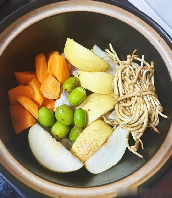 食材:排骨300克、鱼腥草1小把(约30克)、雪梨1个、青橄榄10个、胡萝卜1根、生姜2片、盐一丝